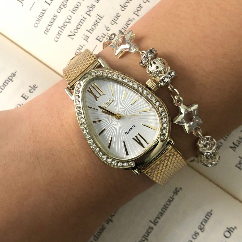 Encante com o Relógio Aurum Serpente, um acessório feminino que une sofisticação e sensualidade. Pulseira elástica em liga de zinco com detalhes em plástico, mostrador dourado com strass que refletem glamour e poder. Analógico, perfeito para ocasiões especiais como festas, casamentos e celebrações, conferindo um toque de exclusividade ao seu look.