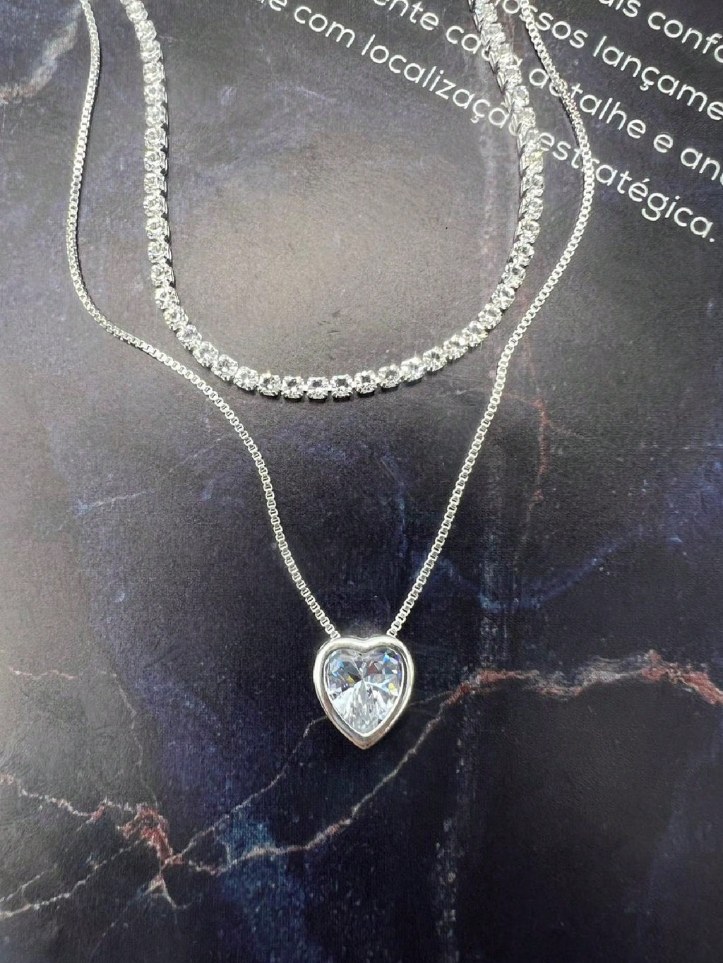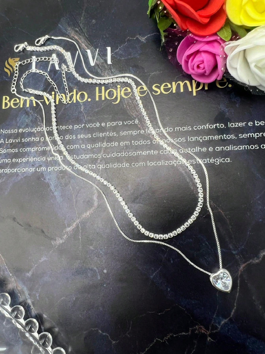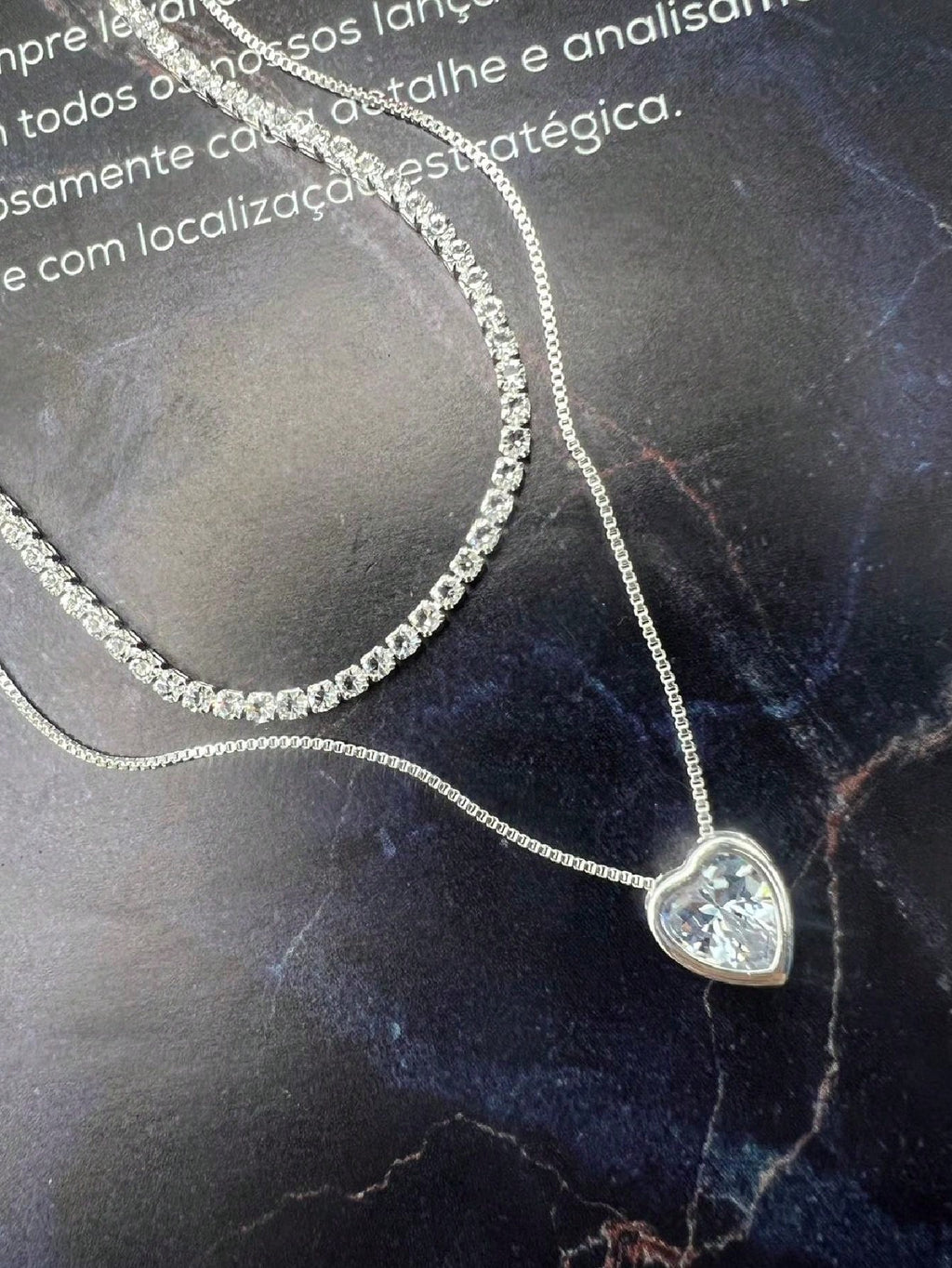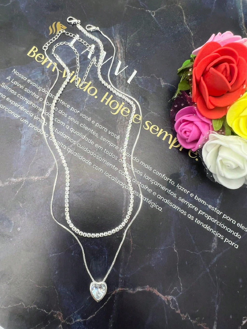 Eleve seu estilo com o Kit 2 Choker Riviera Cristal + Colar com Coração Ponto de Luz. Peças delicadas, folheadas a prata, ideais para momentos especiais como casamentos ou celebrações. O detalhe em coração confere um toque fofo e elegante ao visual.