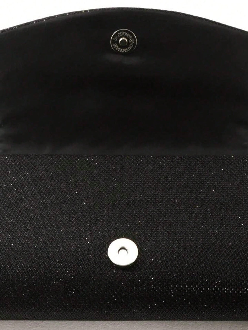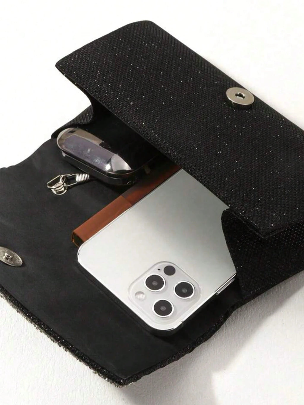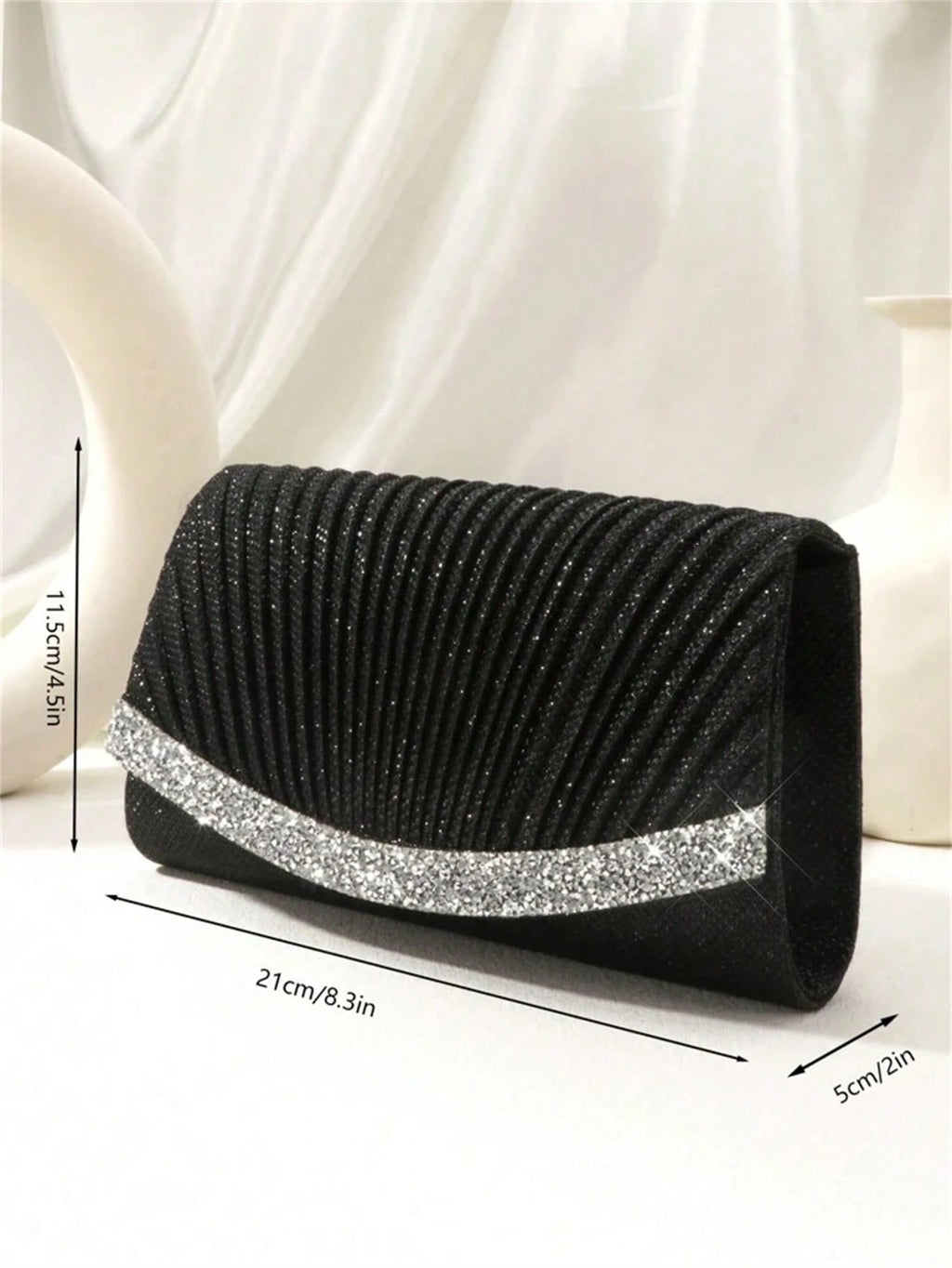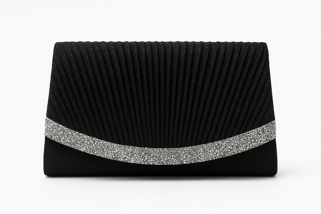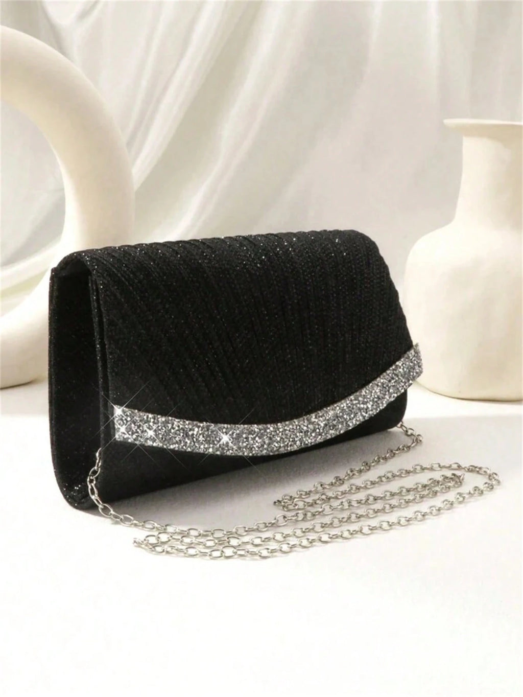 Com design quadrado e plissado, une o glamour do glitter preto com o charme dos strass brilhantes. O fechamento em aba estilo flap e a alça em corrente metálica oferecem praticidade com muito estilo.