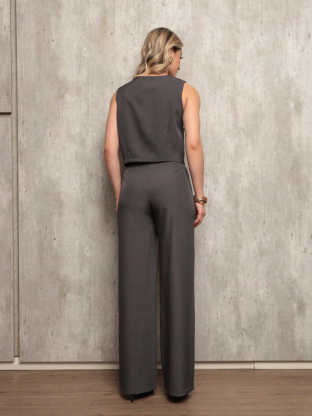 A blusa sem mangas possui gola redonda e fechamento com botões duplos, enquanto a calça comprida completa o conjunto com caimento regular e ajuste confortável. Produzido em tecido composto de alta qualidade, garante durabilidade e acabamento refinado, perfeito para produções sofisticadas do dia a dia.