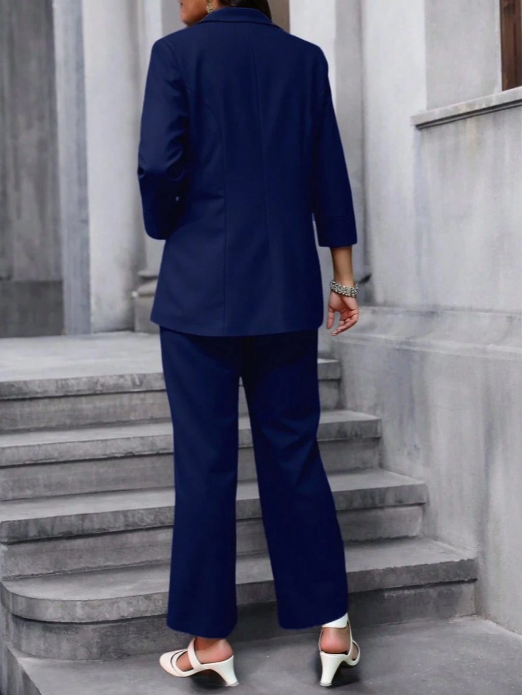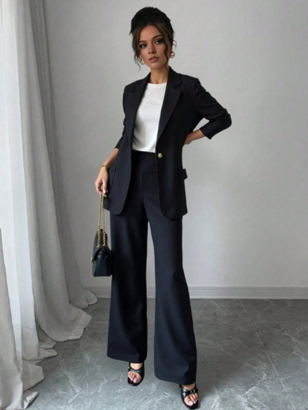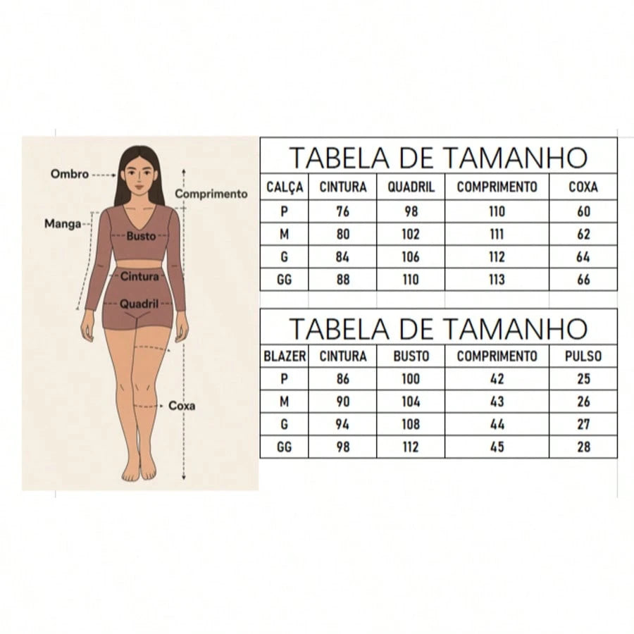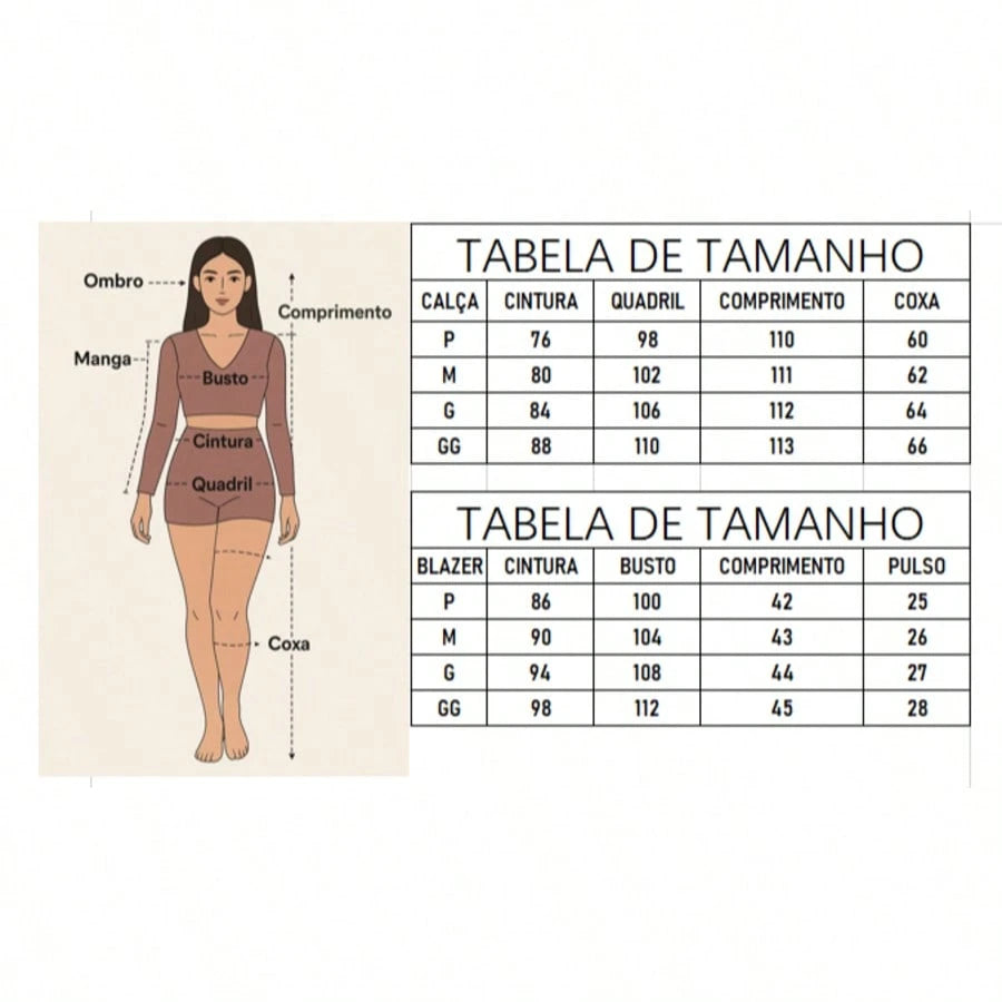 O blazer de manga três quartos com lapela sofisticada apresenta fechamento com botão e bolsos funcionais, enquanto a calça pantalona de cintura alta completa o conjunto com caimento solto, valorizando a silhueta. Produzido em 95% Poliéster e 5% Elastano, oferece conforto, durabilidade e leve elasticidade, mantendo o look impecável o dia todo.