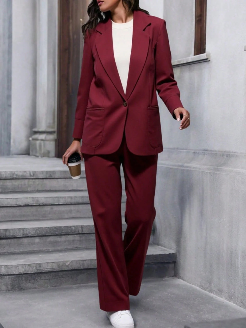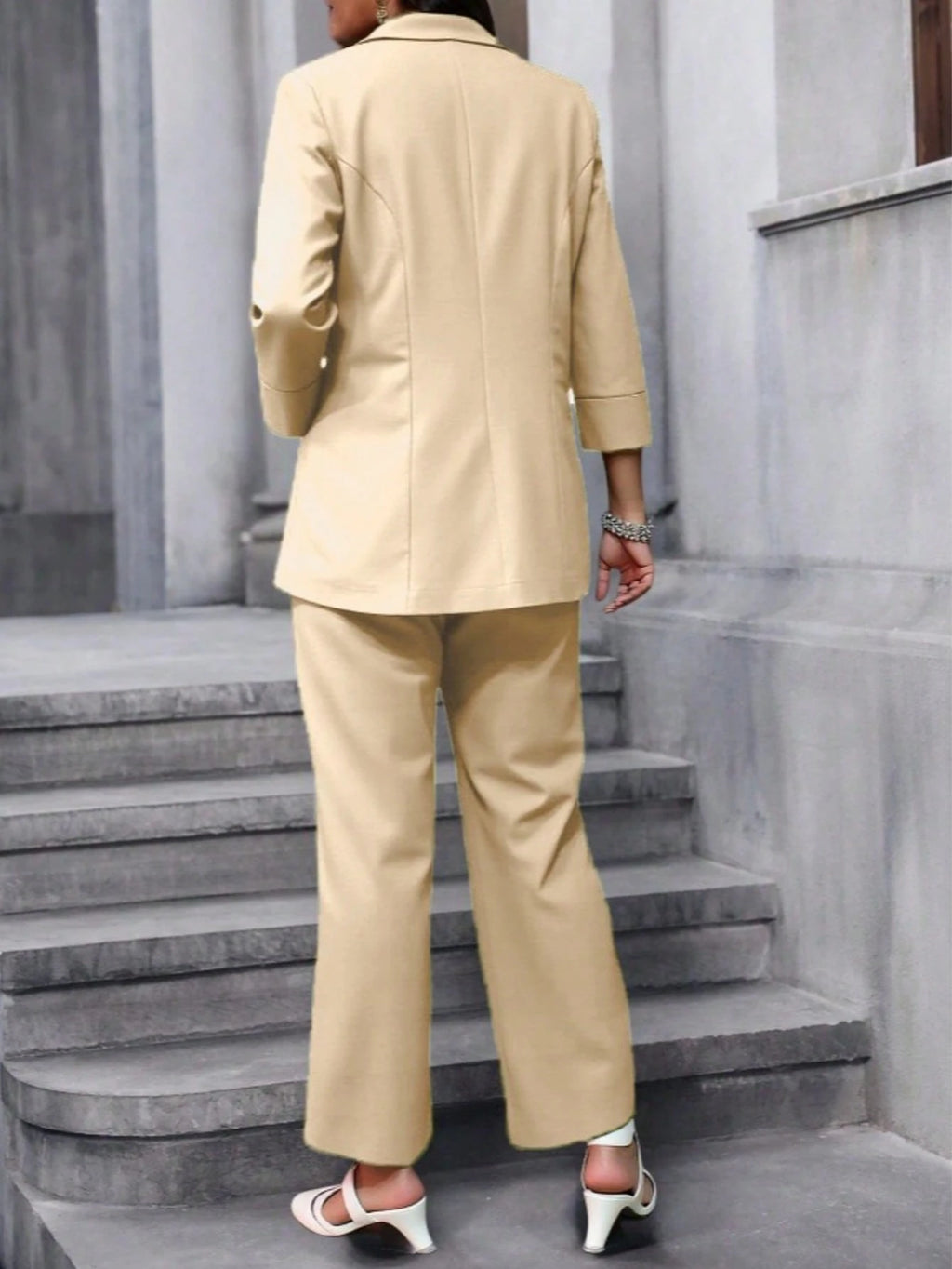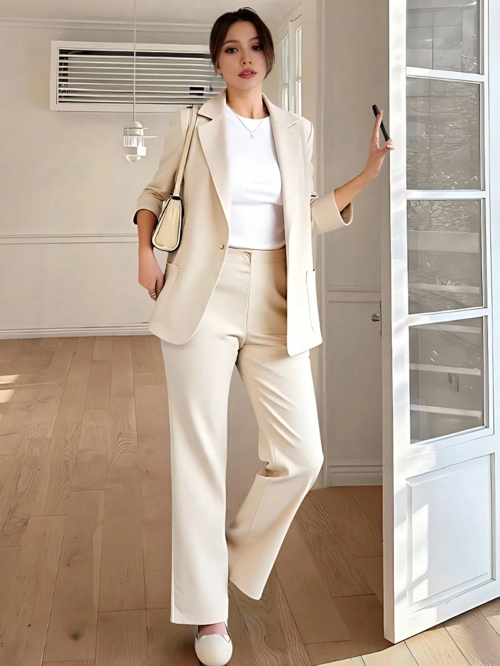 O blazer de manga três quartos com lapela sofisticada apresenta fechamento com botão e bolsos funcionais, enquanto a calça pantalona de cintura alta completa o conjunto com caimento solto, valorizando a silhueta. Produzido em 95% Poliéster e 5% Elastano, oferece conforto, durabilidade e leve elasticidade, mantendo o look impecável o dia todo.