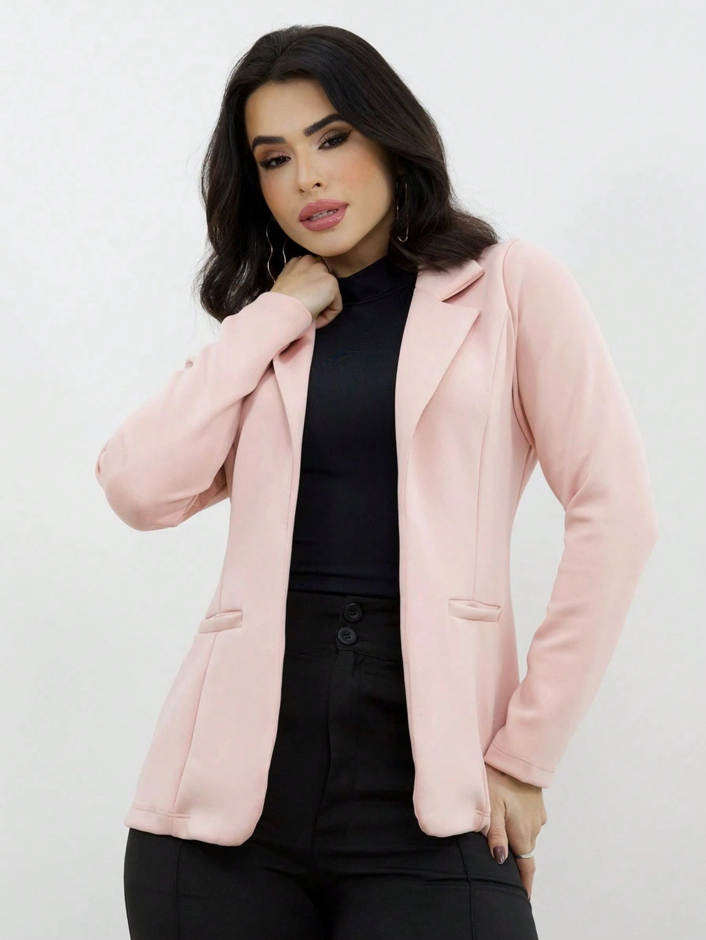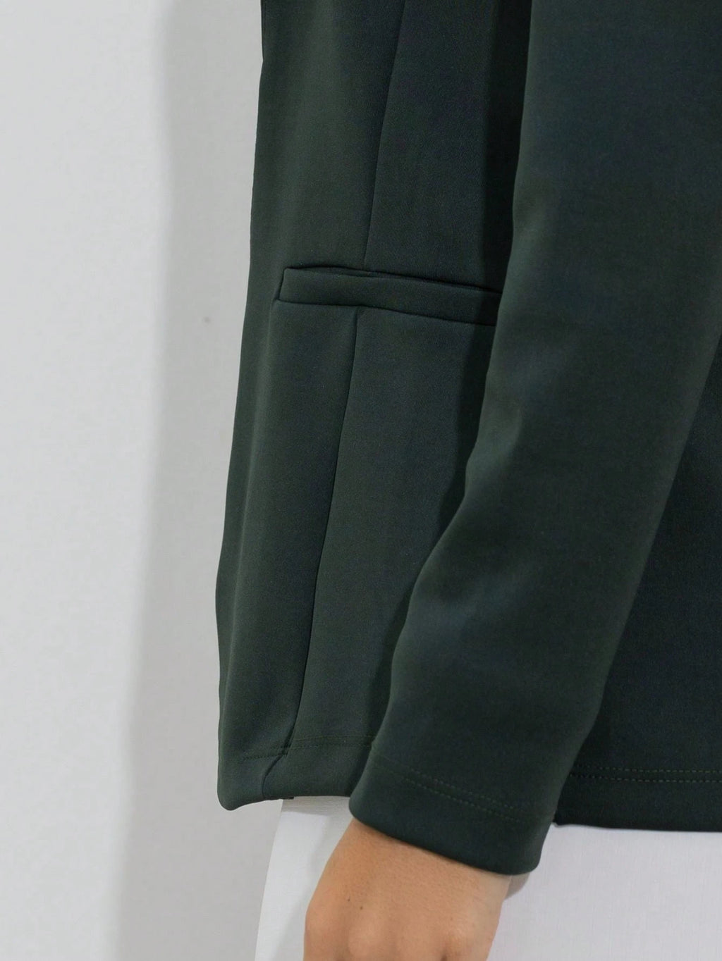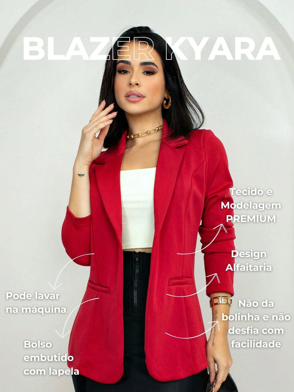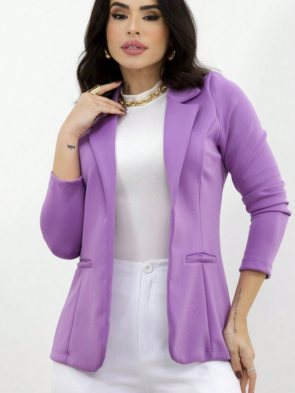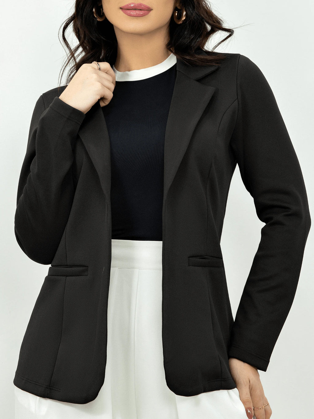 Produzido em tecido de malha de alta qualidade (93% Poliéster, 7% Elastano), oferece elasticidade média para conforto sem perder a estrutura. Os detalhes em botão e lapela clássica, junto à bainha assimétrica, conferem toque moderno, enquanto os bolsos falsos adicionam charme sutil.