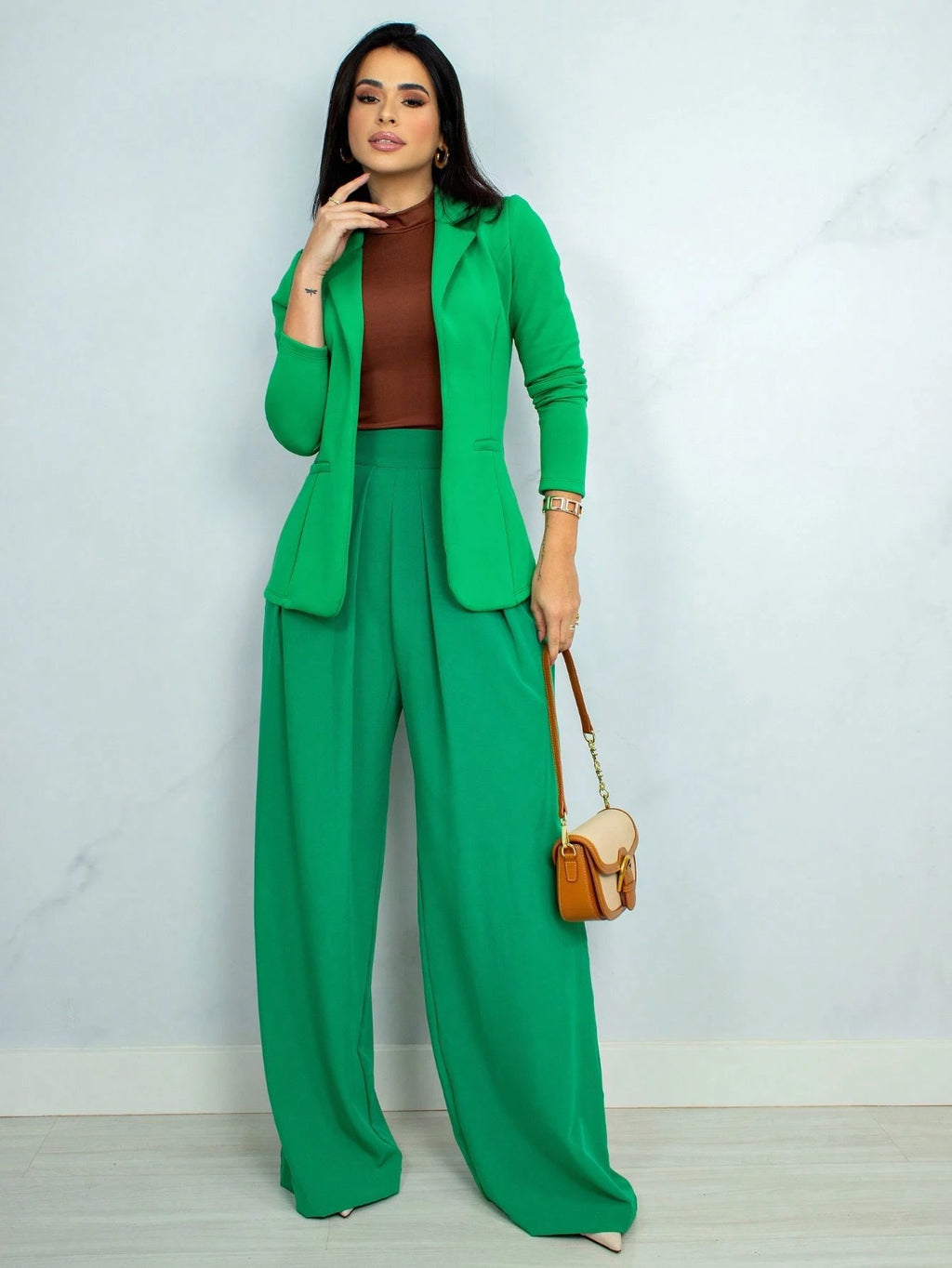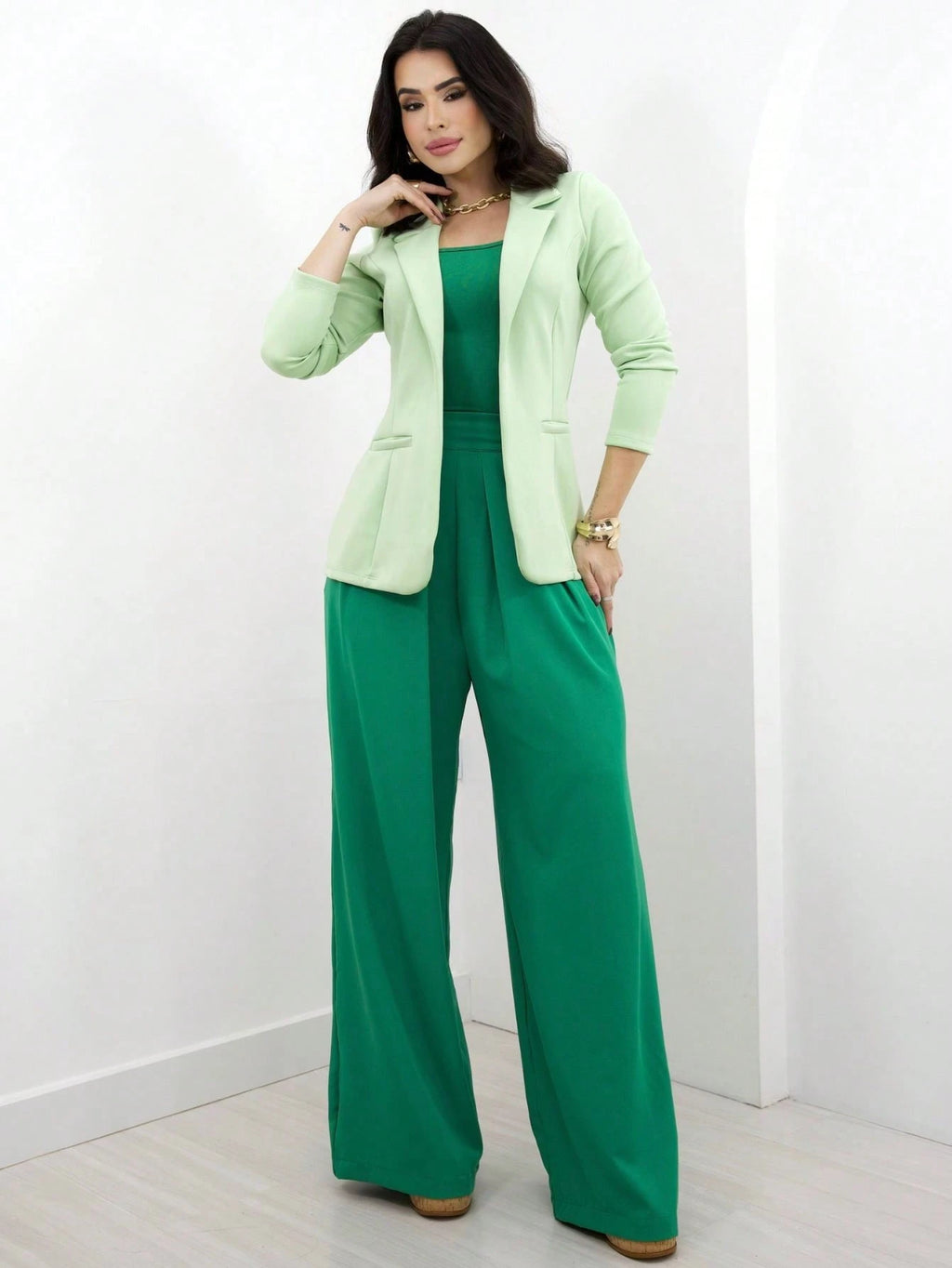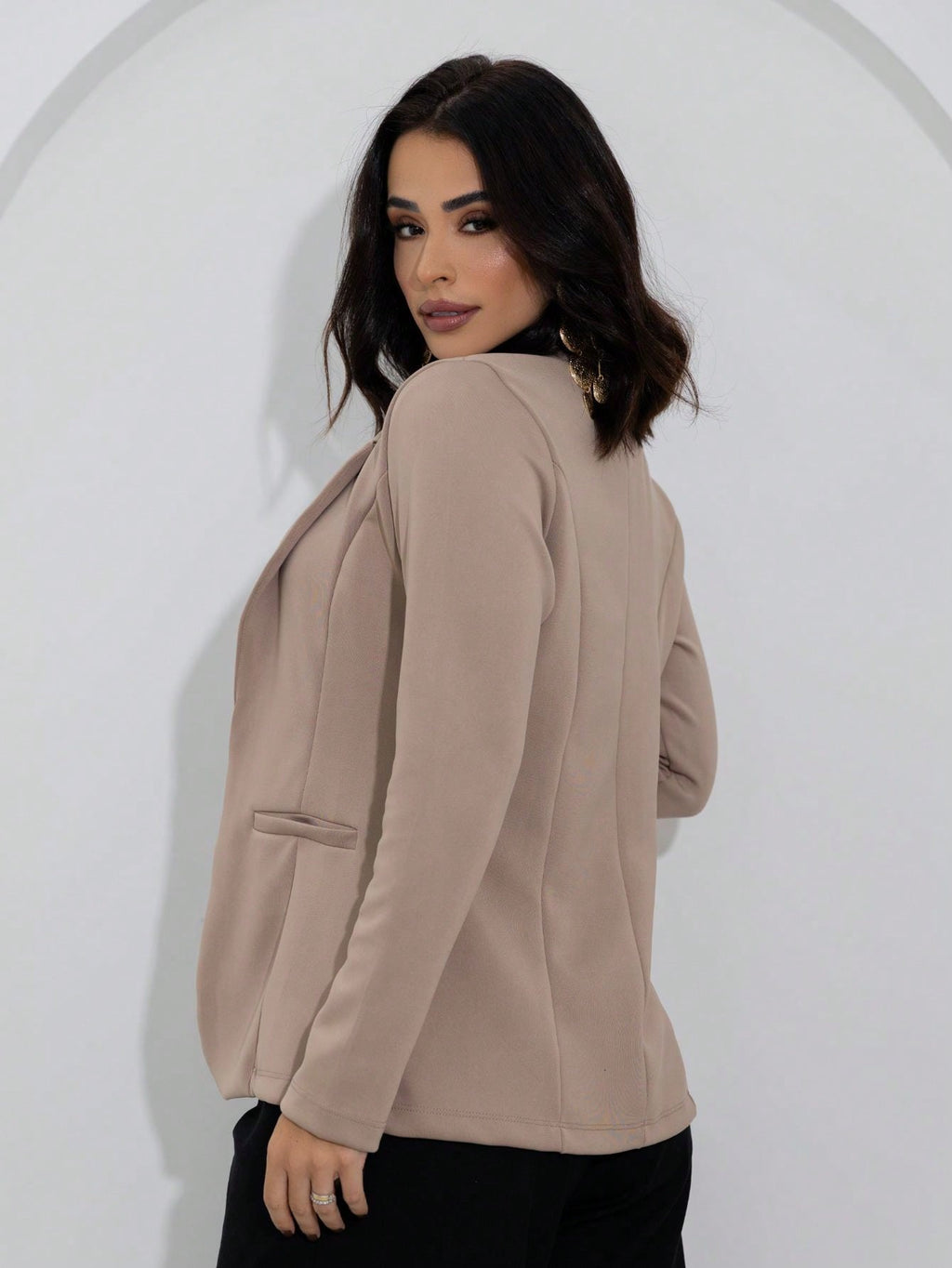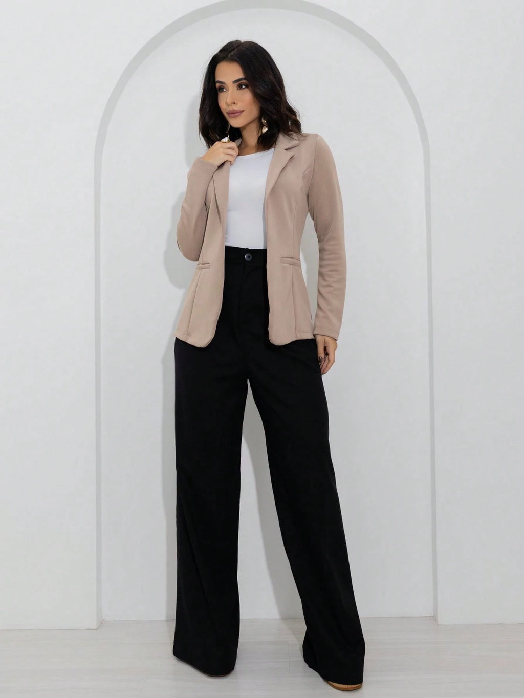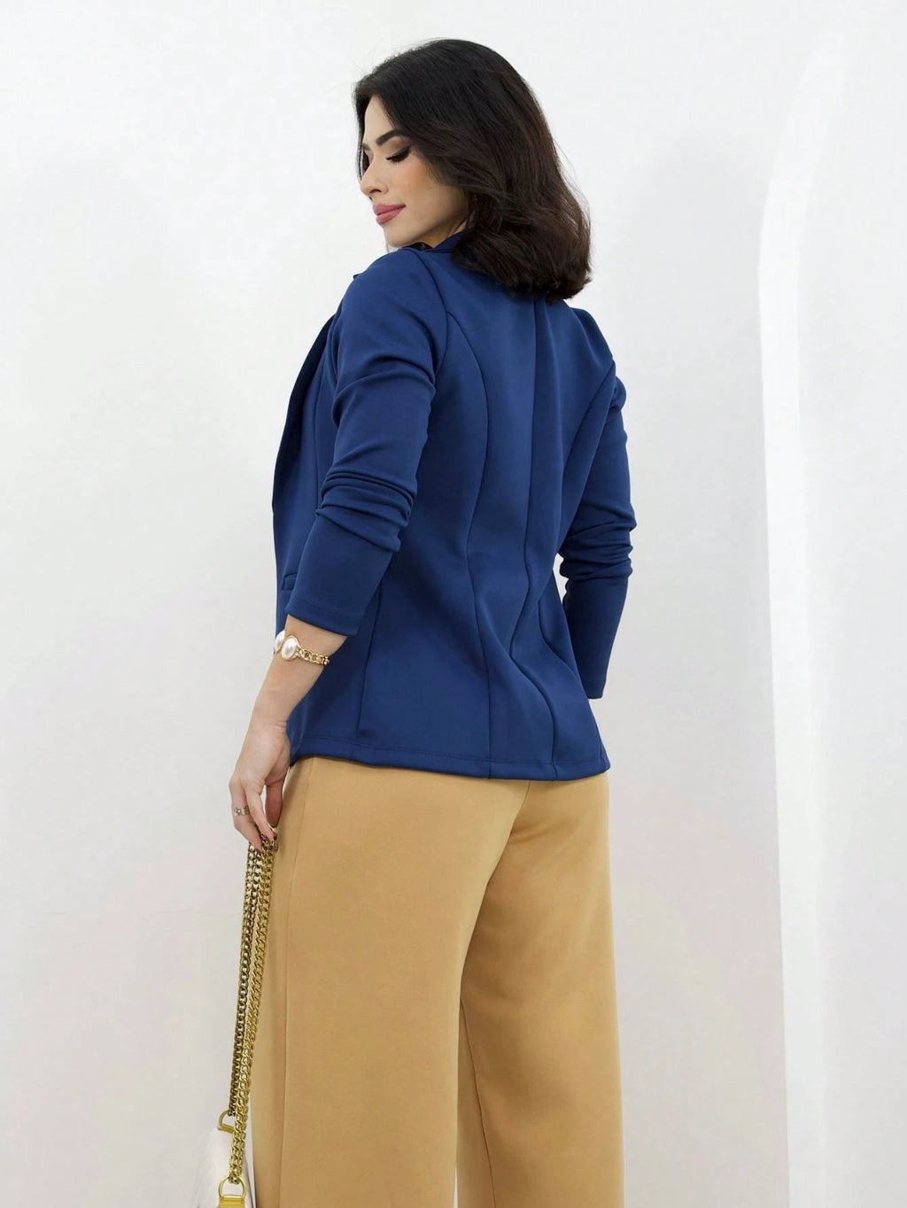 Produzido em tecido de malha de alta qualidade (93% Poliéster, 7% Elastano), oferece elasticidade média para conforto sem perder a estrutura. Os detalhes em botão e lapela clássica, junto à bainha assimétrica, conferem toque moderno, enquanto os bolsos falsos adicionam charme sutil.