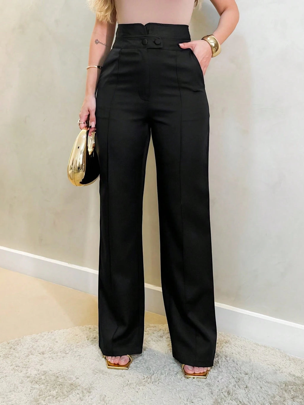 Sofisticação e conforto em um só modelo com a Calça Pantalona Social Preto “MARINA” Gamora Brasil. Com cintura alta e perna larga, proporciona caimento regular e elegante, ideal para looks casuais ou ocasiões formais.