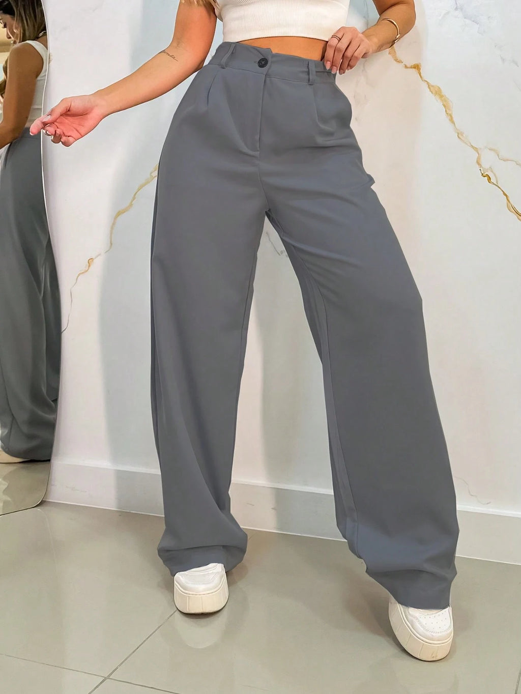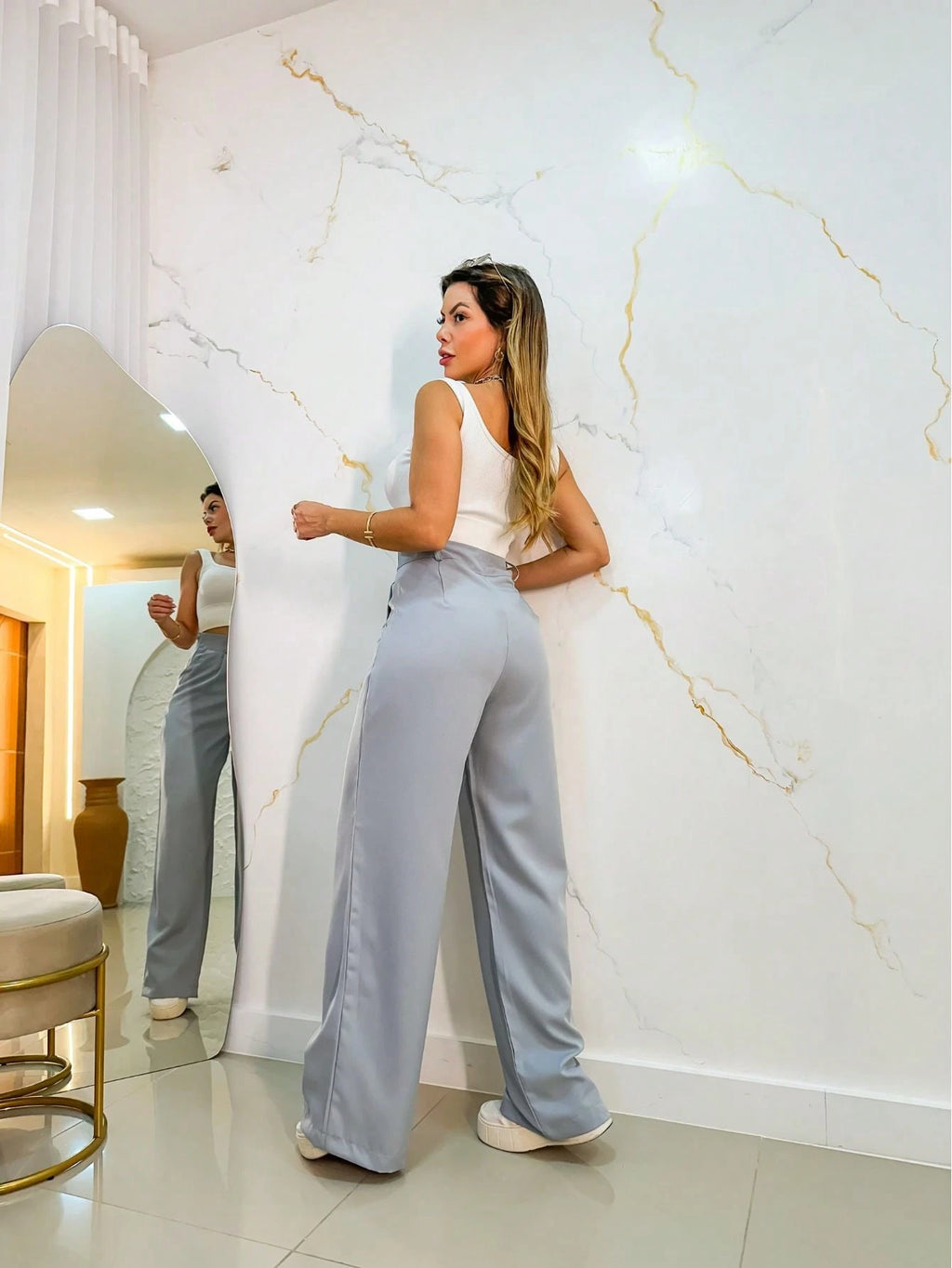 Conforto e estilo para o dia a dia com a Calça Pantalona Alfaiataria Cinza Midi “OLÍVIA” Gamora Brasil. Com cintura alta e caimento solto, a peça garante elegância e liberdade de movimento, perfeita para produções casuais ou eventos informais.