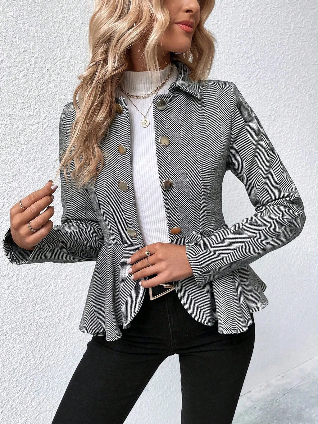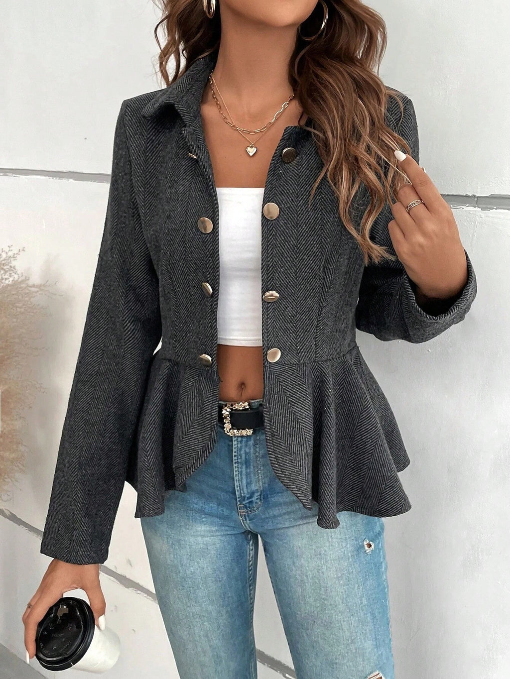 O blazer apresenta abotoamento duplo, fechamento trespassado e bainha com babado, criando um design assimétrico e sofisticado. Com manga longa e caimento slim fit, a peça valoriza a silhueta de forma elegante. Produzido em 100% Poliéster, oferece conforto e estrutura sem perder a forma.