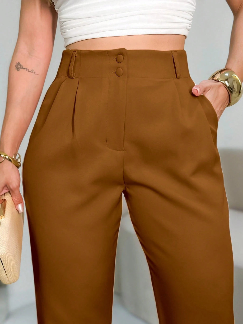 Produzida em tecido leve de alta qualidade (95% Poliéster, 5% Elastano), a peça oferece elasticidade suave, garantindo ajuste perfeito sem perder a forma. Os detalhes em botões duplos encapados, pregas na barra e bolsos funcionais adicionam charme e funcionalidade, tornando-a ideal para looks casuais, formais ou noturnos.