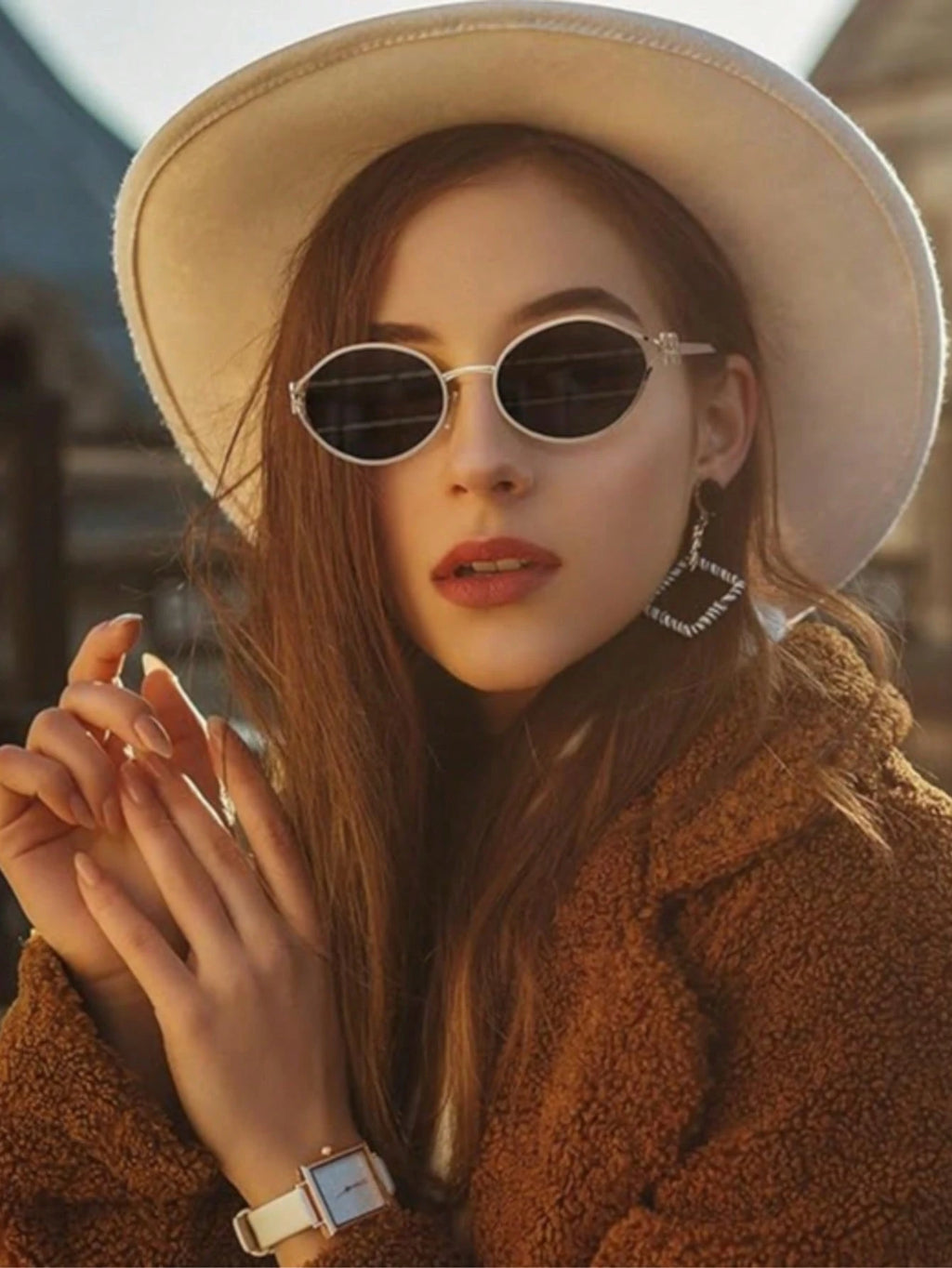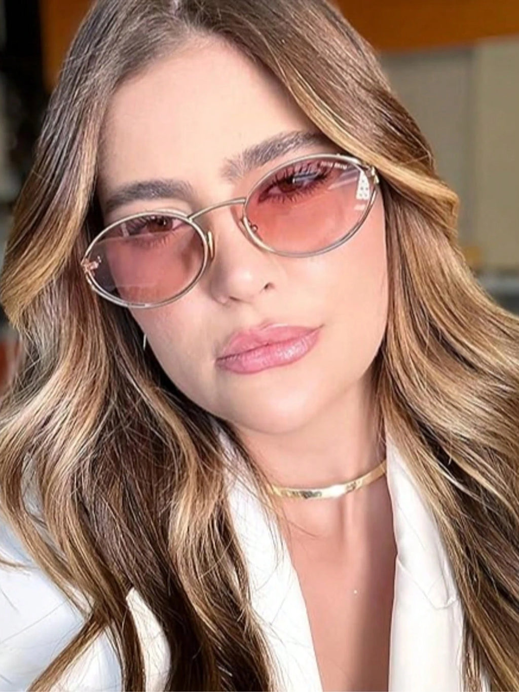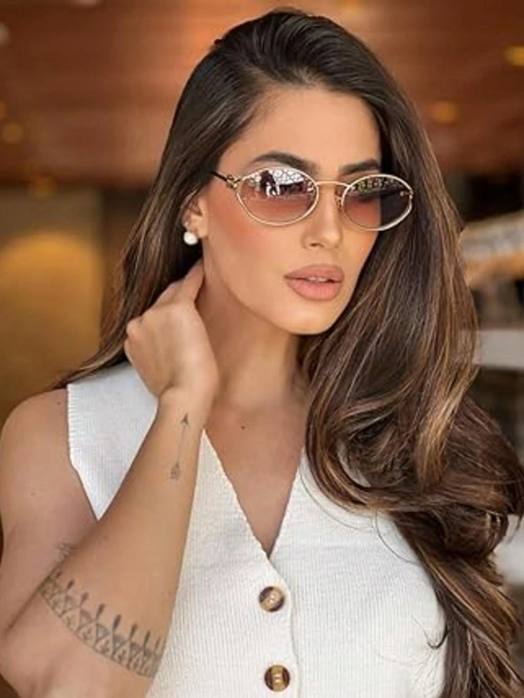 Óculos de sol ovais retrô, com proteção UV400 para manter seus olhos seguros sem abrir mão do estilo. Armação em metal resistente com toque vintage e detalhe em cadeia, oferecendo um design elegante e atemporal. Ideal para looks casuais, urbanos ou sofisticados.